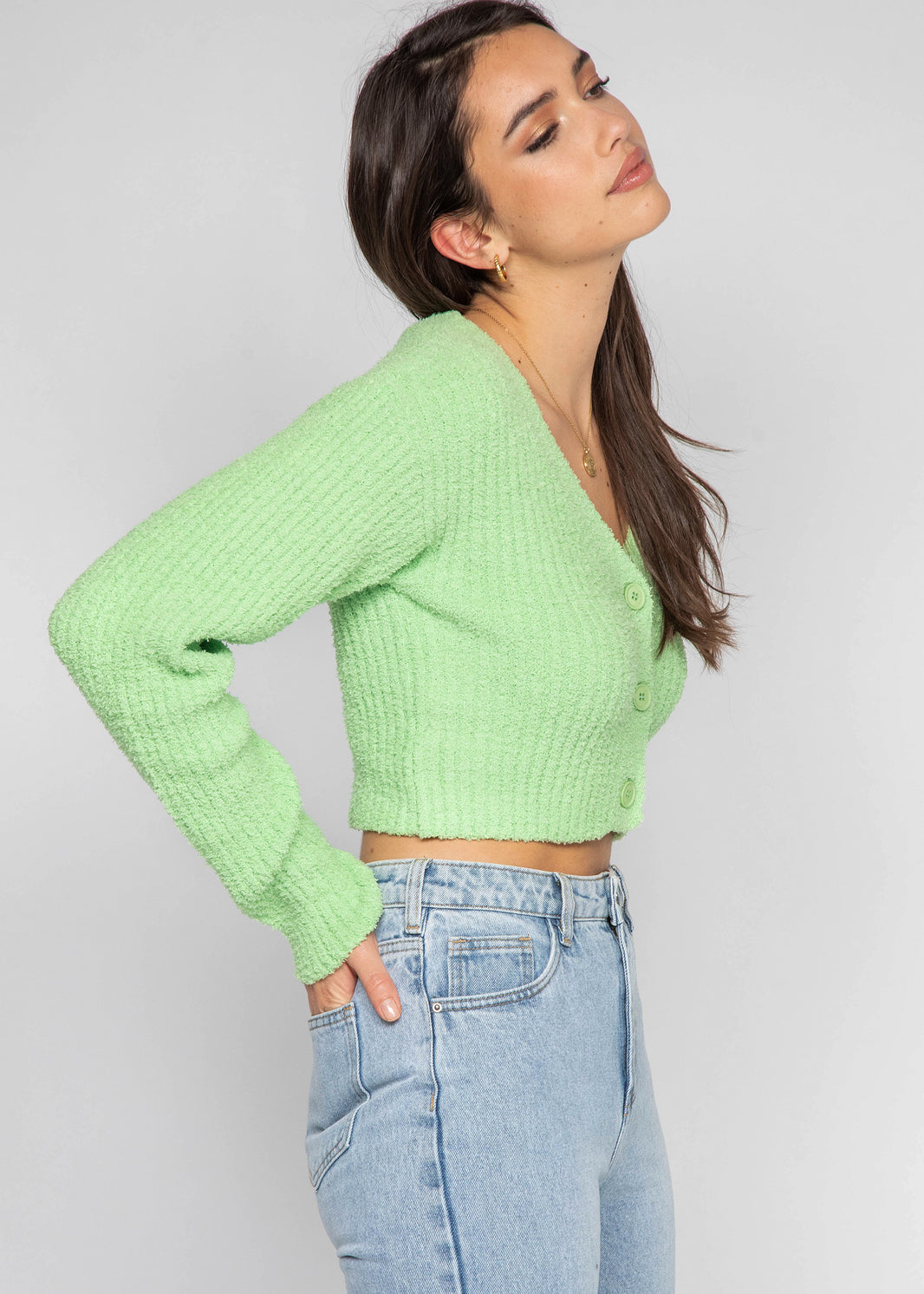 Ruffle hem button front ribbed cardigan in green